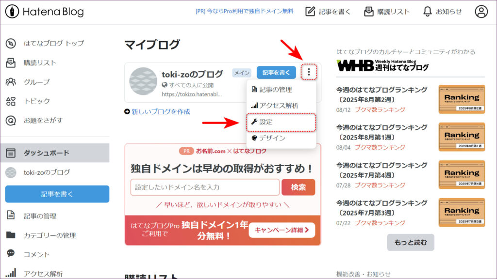 ブログ管理画面(ダッシュボード)の中央に、「マイブログ」として作成したブログが表示されているので、編集したいブログの「三点マーク」をクリックして、「設定」をクリックします。