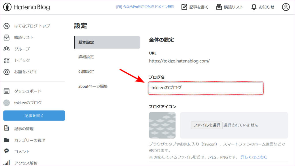 はてなブログを作成した初期の状態では、ブログタイトルは「(はてなID)のブログ」となっているので、設定画面からブログタイトルの変更を行っておきましょう。