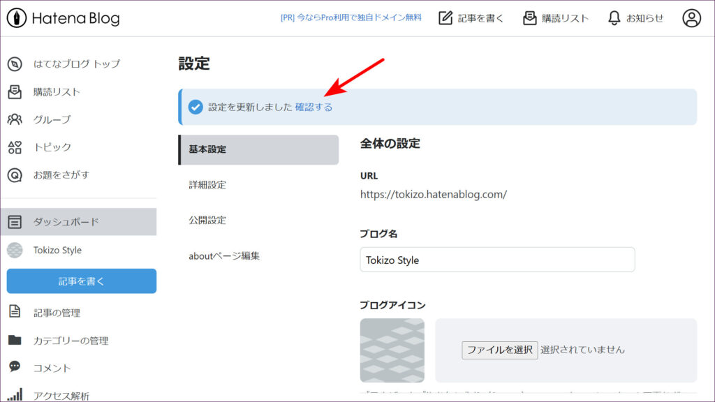 設定が更新され、ブログタイトルが変更されました。「確認する」をクリックすると、実際のブログにアクセスできます。