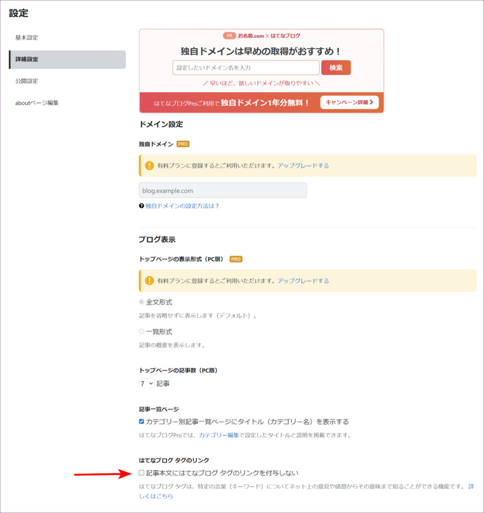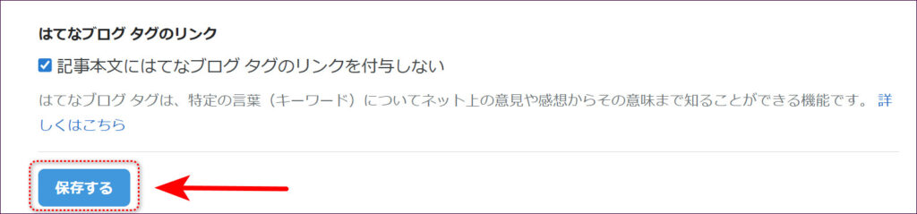 画面をスクロールさせ、「記事本文にはてなブログ タグのリンクを付与しない」にチェックを入れる