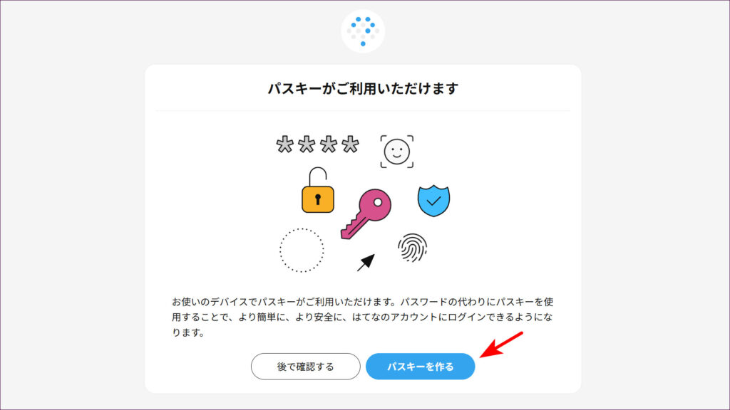 「パスキー」についての画面が表示されます。パスキーとは、ログインする際に、パスワードの代わりに生体認証(指紋認証や顔認証など)やデバイスのロック機能(PINなど)を使ってログインできる仕組みです。セキュリティが強化されますので、作成することをおすすめします。