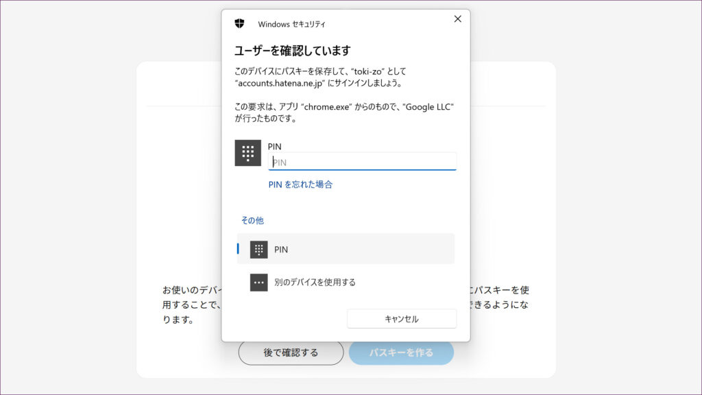 ご自身のパソコンで日ごろ使っている「PIN」を入力します。