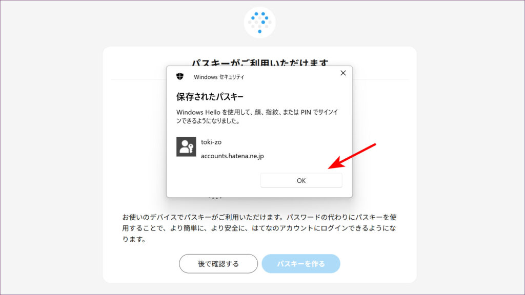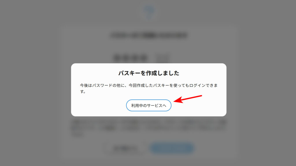「パスキーを作成しました」という画面が表示されたら、「利用中のサービスへ」をクリックします。