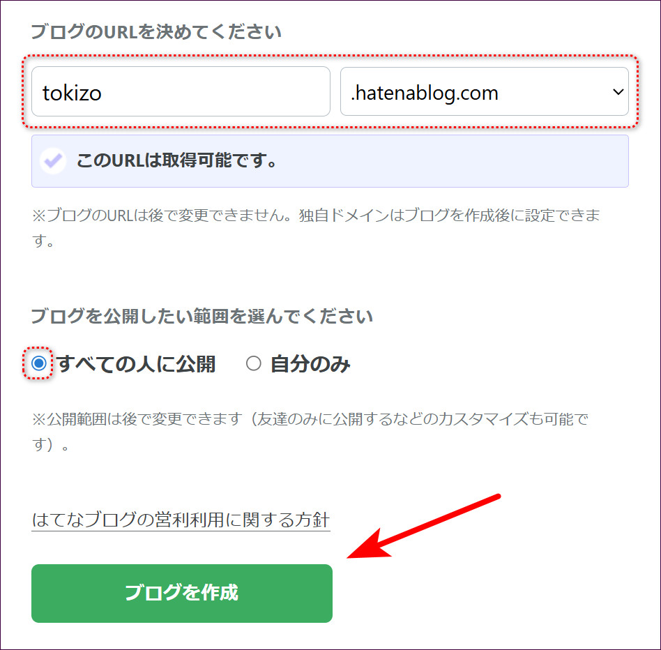 「ブログのURL」「ブログを公開したい範囲(通常は、すべての人に公開を選択します)」を設定したら、「ブログを作成」をクリックします。