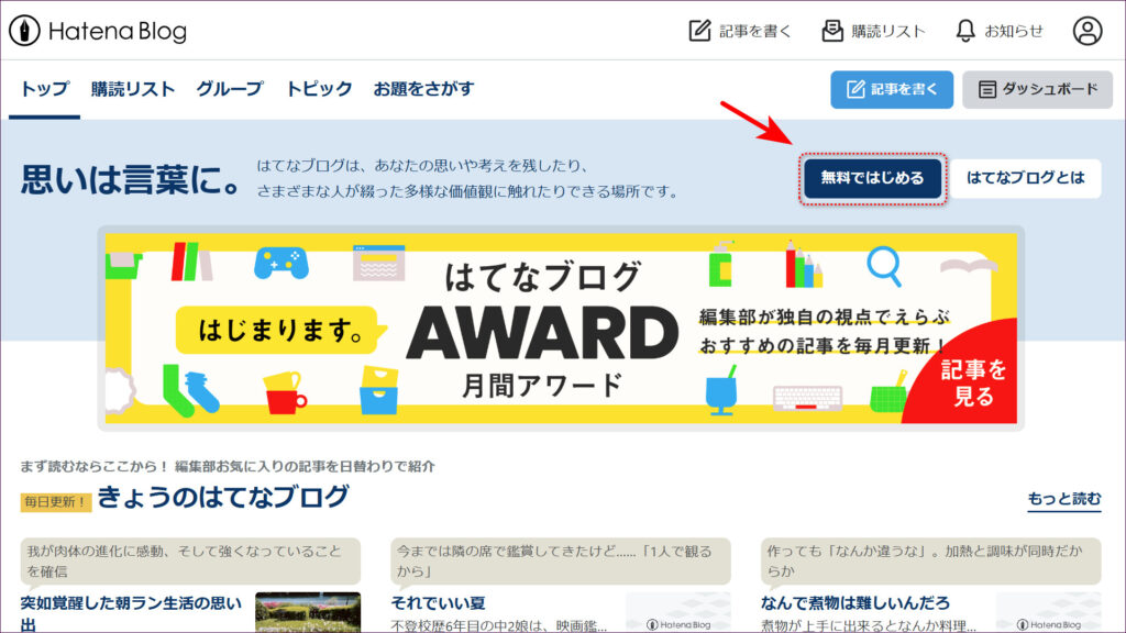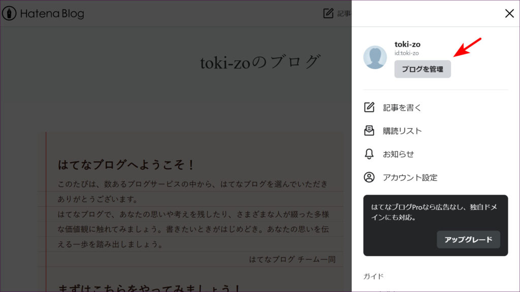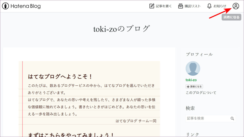 ここまでの作業で、はてなブログが作成されました。続いて、ブログの管理画面にアクセスしてみましょう。画面右上の人型のアイコンをクリックします。