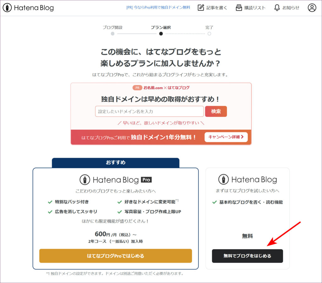 プランの選択の画面が表示されます。無料プランで利用する場合は、「無料でブログをはじめる」をクリックします。