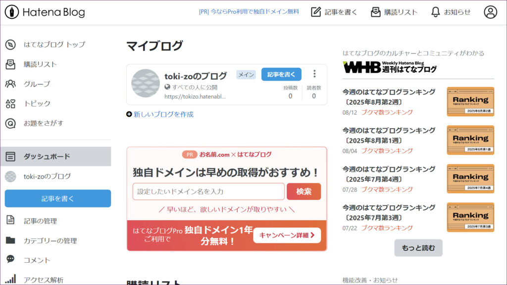 ブログの管理画面(ダッシュボード)が表示されます。今後、記事を書いたり、ブログのデザインを変更したりするのは、この管理画面から行います。
