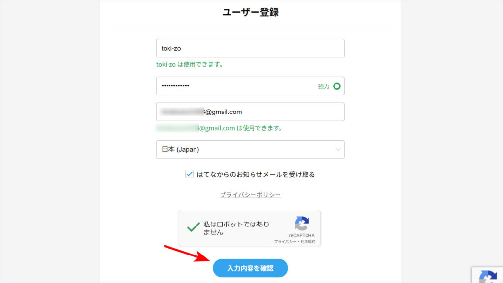 「はてなID」「パスワード」「メールアドレス」を入力したら、「入力内容を確認」をクリックします。