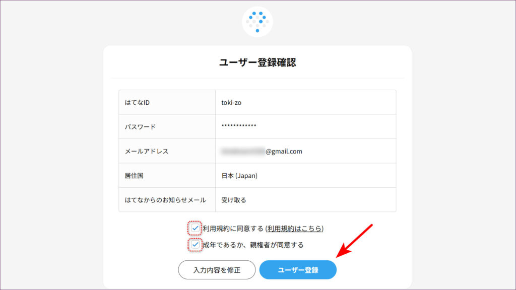 確認画面が表示されるので間違いがなければ、「利用規約に同意する」「成年であるか、親権者が同意する」にチェックを入れ、「ユーザー登録」をクリックします。