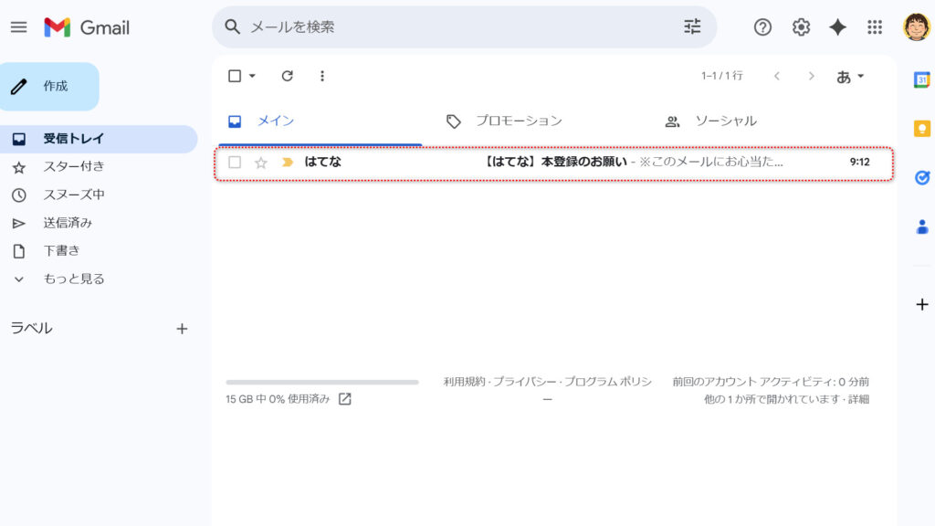 「はてな」から「本登録のお願い」という件名のメールが届くので、そのメールを開きます。